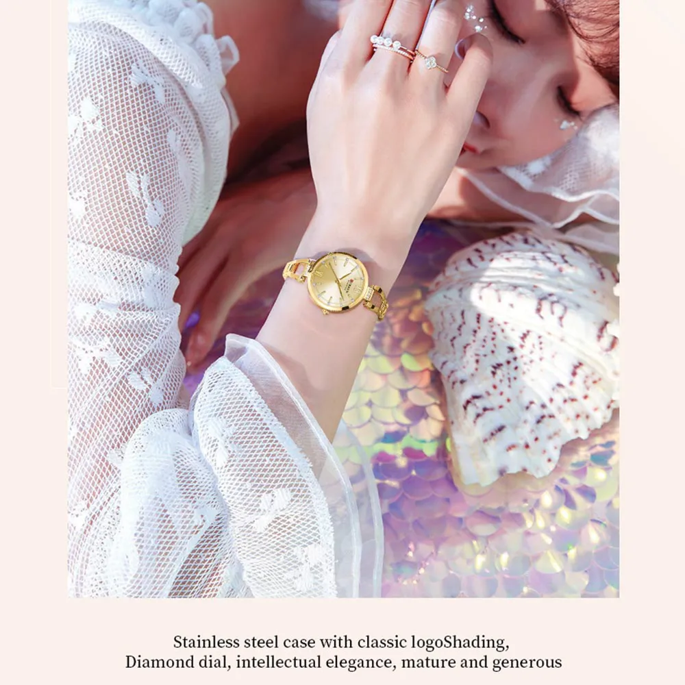 This elegant timepiece features a 30 mm alloy case with a 9 mm slim profile, accompanied by a sleek stainless-steel bracelet (approx. 22 cm length, 8 mm width). Powered by accurate quartz movement, it shines with luminous hands and sparkling rhinestone bezel, blending fashion with functionality. Protected by hardened mineral glass and rated 3 ATM water resistance, it’s perfect for daily wear. 100% Original product with 1-Year Official Warranty from cardinalbd, ensuring confidence in your purchase.